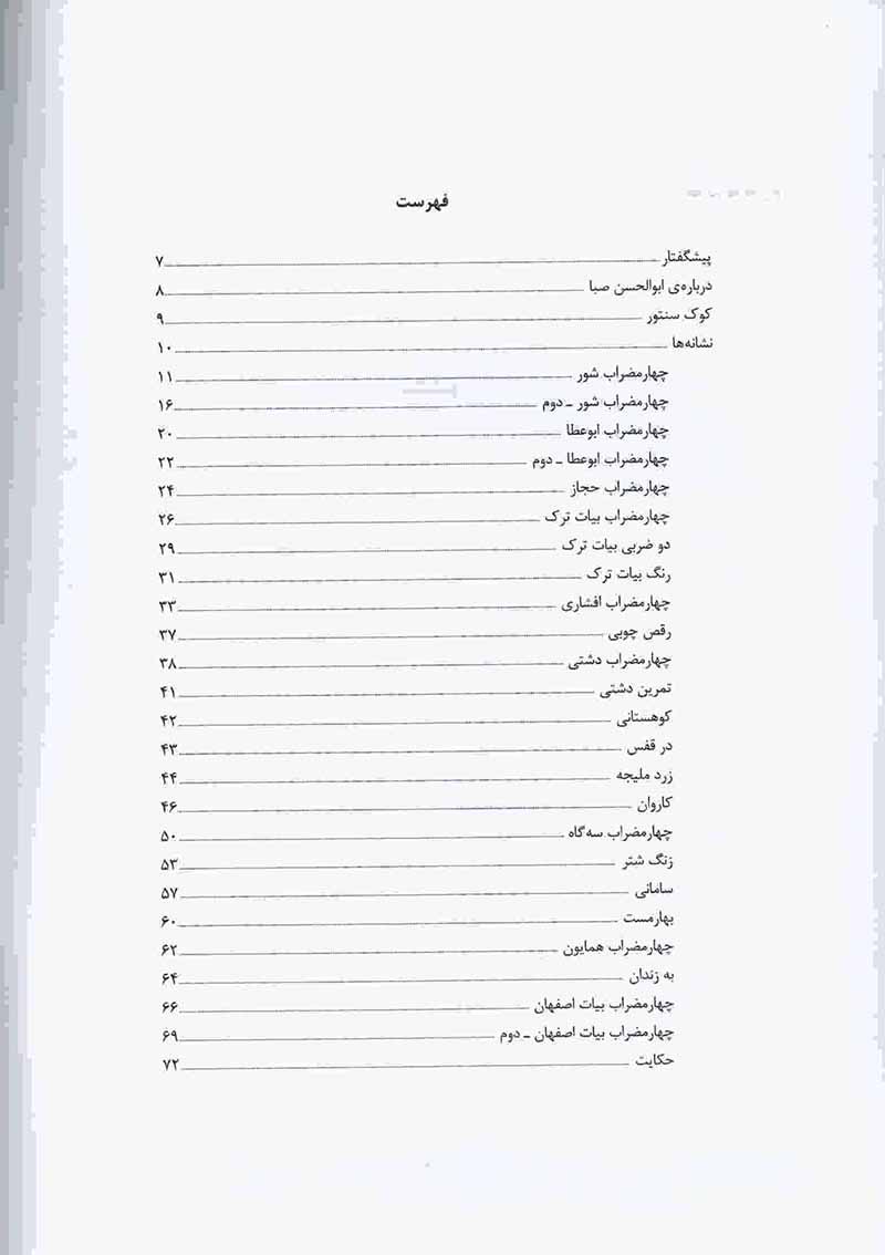 این مجموعه شامل 25 قطعه است که در دوره های سنتور ردیف استاد ابوالحسن صبا موجود است