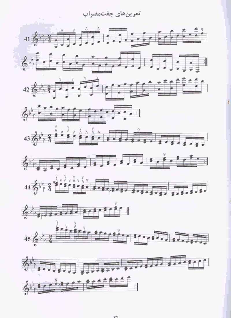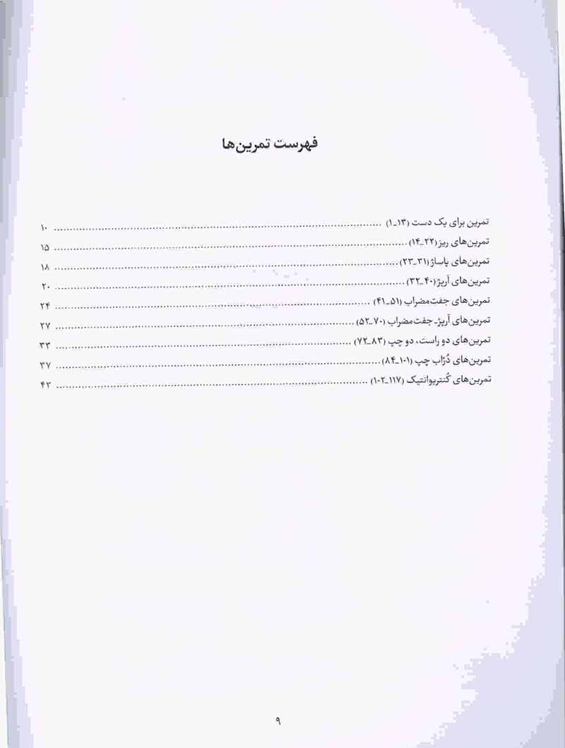 این مجموعه در نه بخش مجزا شامل تمرین هایی برای یک دست تمرین های ریز پاساژ آرپژجفت مضراب آرپژجفت مضراب