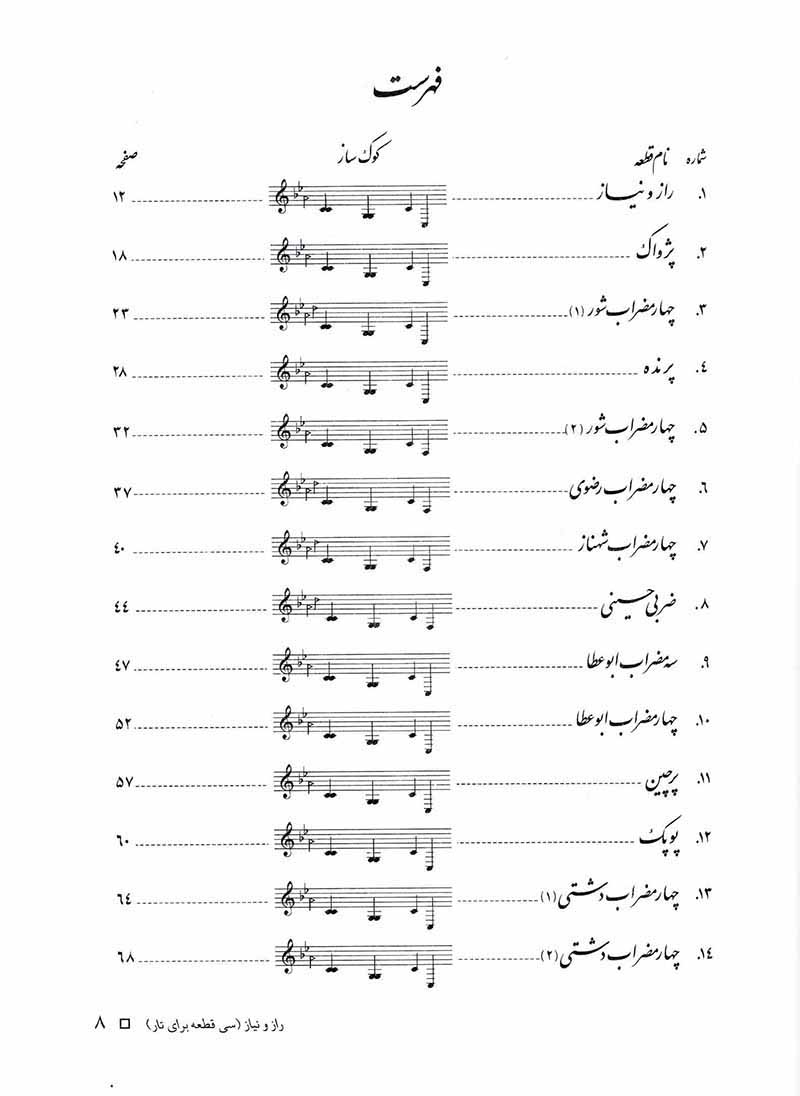 مجموعه حاضر، سی قطعه از آثار استاد فرامرز پایور می باشد که از کتاب های قطعات موسیقی مجلسی، ردیف ابتدایی سنتور، سی قطعه چهار مضراب، فالگوش و هشت اهنگ انتخاب گردیده است. در تنظیم و برگردان قطعات این کتاب، از انواع مضراب های معمول برای ساز تار استفاده شده و انگشت گذاری ها نیز با توجه به هماهنگ بودن آنها با فرم مضراب ها تنظیم شده است که به اجرای هرچه روان تر و منطقی تر آنها کمک کرده است.