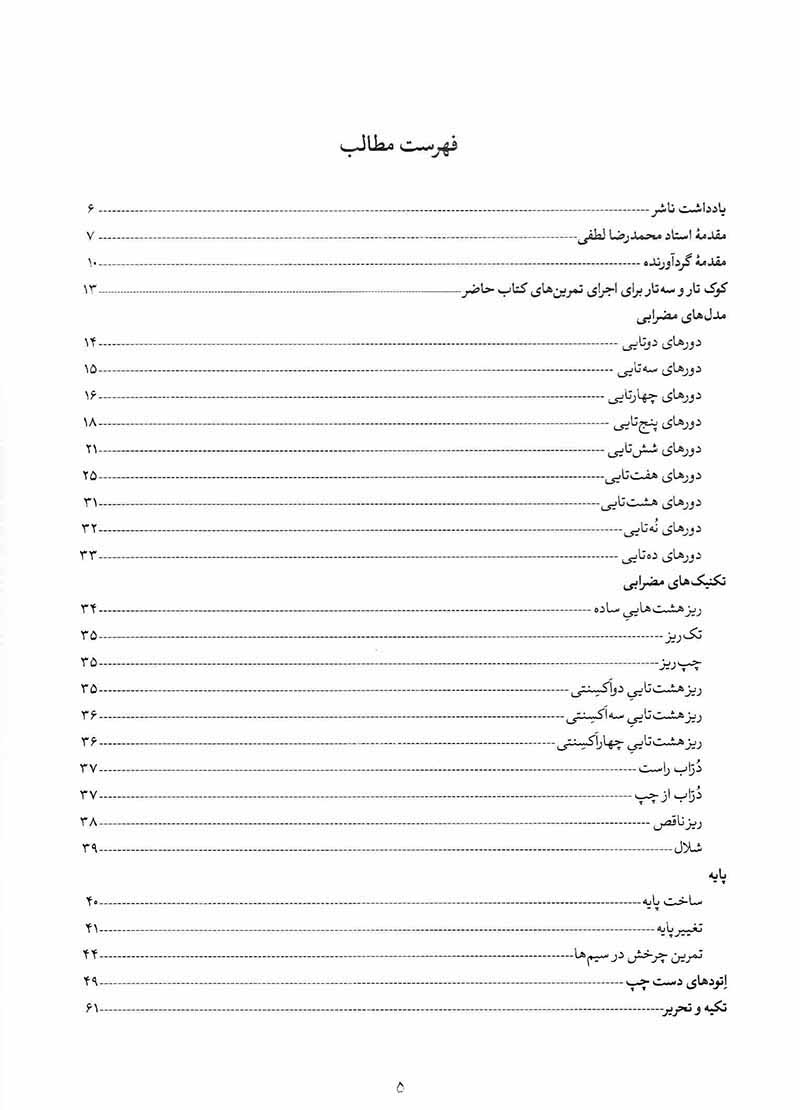 متدی که فراوری خود دارید شرح یک ترم از کلاس « مبانی فن نوازندگی » استاد محمدرضا لطفی است که به خواست ایشان توسط یکی از شاگردانشان نگارش شده و با تایید و مقدمه ایشان به سامان رسیده است. تمرین های کتاب حاضر با نگرش موسیقی ایرانی همگون اند، موزیکالته هنرجویان را تقویت کرده هنرجو را به خلاقیت هنری نزدیک می گردانند و در جهت آموزش روش تمرین حرکت می کنند که مشکل بسیاری از هنرجویان است. « دورهای مضرابی » ( از دو تایی تا دوازده تایی با توالی های گوناگون راست و چپ مضراب و تغییر در تعداد و محل اکسنت ها)، « تکنیک های مضرابی » ( برای تقویت اجرای انواع ریز، دراب و شلال )، « ساخت و تغییر پایه » ( با استفاده از الگوهای مضرابی، تغییر اکسنت، چرخش در سیم ها و به کار گیری تزئینات)، « ساخت ملودی بر اساس پایه »، « تمرین های دست چپ » ( با انواع انگشت گذاری)، و انواع « تکیه و تحریر » اهم مطالب این متدرا در بر میگیرند.