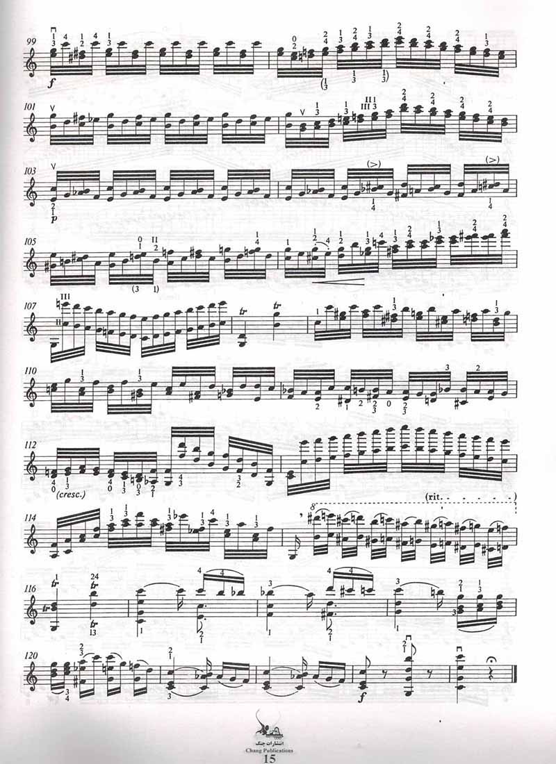 کتاب پیش رو ، 24 کاپریس برای ویولن سلو اثر نیکو پاگانینی می باشد. نقطه اوج و کمال فرم آثار پاگانینی را می توان در تمام 6 کنسرتوی وی برای ویولن مشاهده کرد. اما نمیتوان تاثیر 24 کاپریس وی را در تکنیک نوازندگی ویولن نادیده گرفت. از ویژگی های مهم آثار وی میتوان به کاربرد هارمونیک ها، استفاده از افه های مختلف، به کار گیری سبک ها و شیوه های گوناگون آرشه کشی، بهره مندی استکاتو و پستیکاتوهای که قبلا مورد استفاده قرار نمیگرفت اشاره کرد.