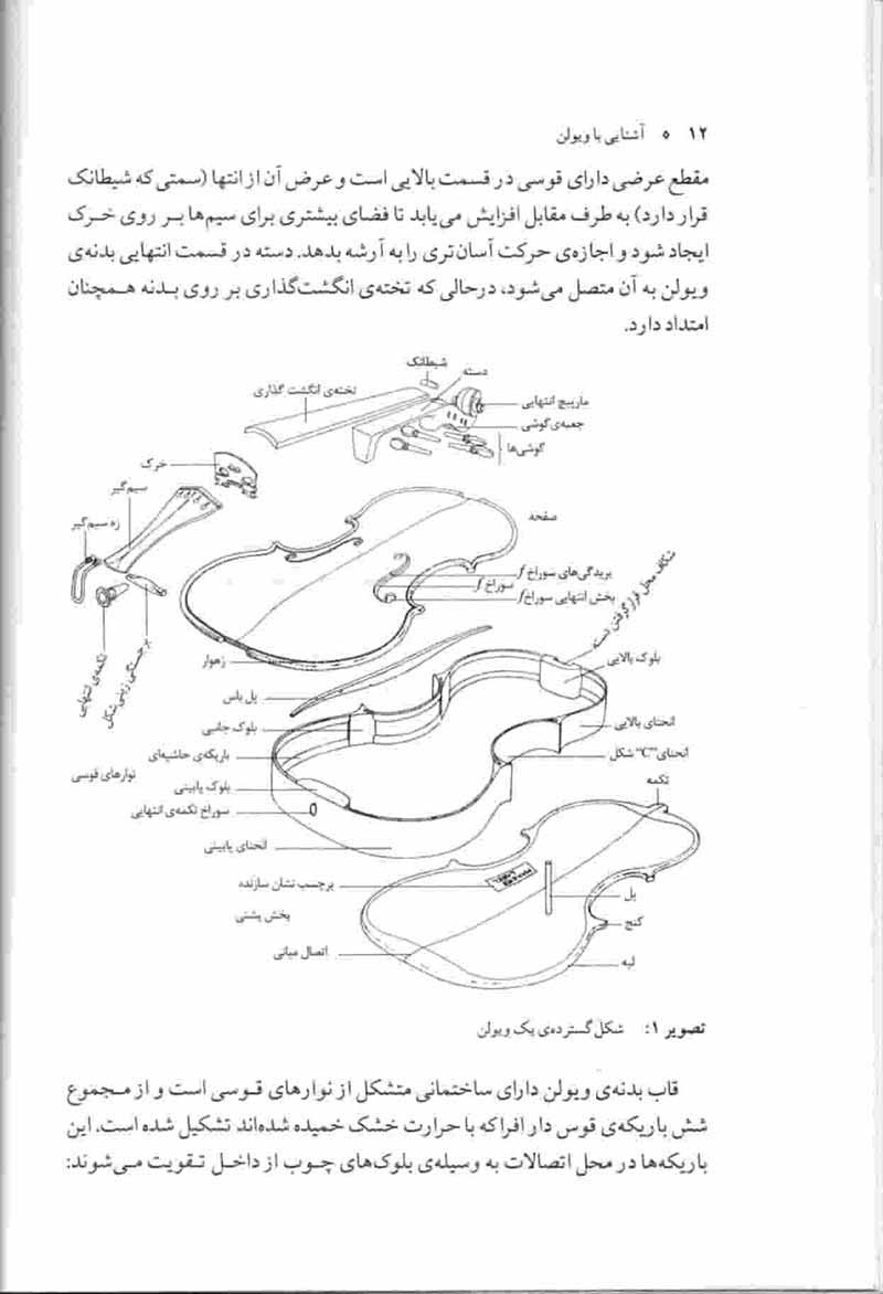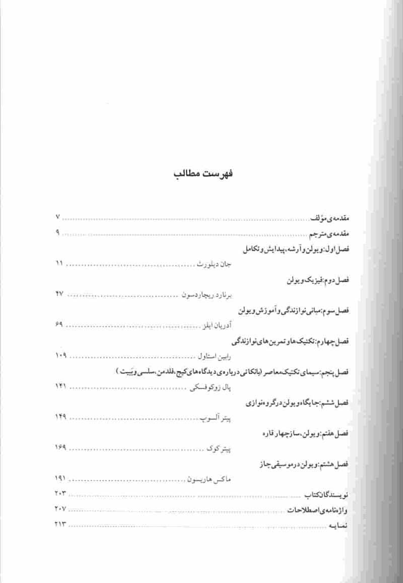 فصل های تشکیل دهنده این کتاب توسط دوستان و همکارانی که در رشته خویش تخصص داشته اند ترتیب یافته است و محور اصلی این کتاب بررسی کلی و فشرده تاریخ ویولن میباشد.
