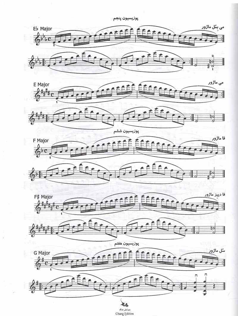 این کتاب، شامل تمرین های گام بدون تغییر پوزیسیون، تغییر پوزیسیون روی یک سیم، ارتباط پوزیسیون ها با یکدیگر، تمرین گام ها و آرپژهادر دو و سه اکتاو، تمرین گام ها و آرپژها روی یک، دو، سه و چهار سیم، معرفی برخی از تکنیک های آرشه کشی، اجرای گام های ماژور و مینور با انگشت گذاری های مختلف است.