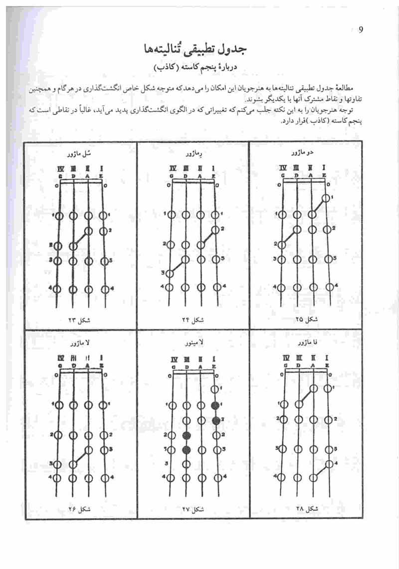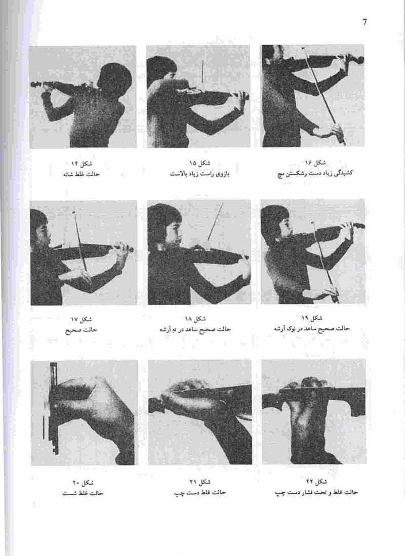 طرز نگه داشتن ساز و آرشه و حالات گوناگون بدن و دستها در هنگام اجرای تکنیکهای مختلف و توضیح برخی مطالب و یا علائم به کار رفته بسیار مهم است در این کتاب به کار گرفته شده است.