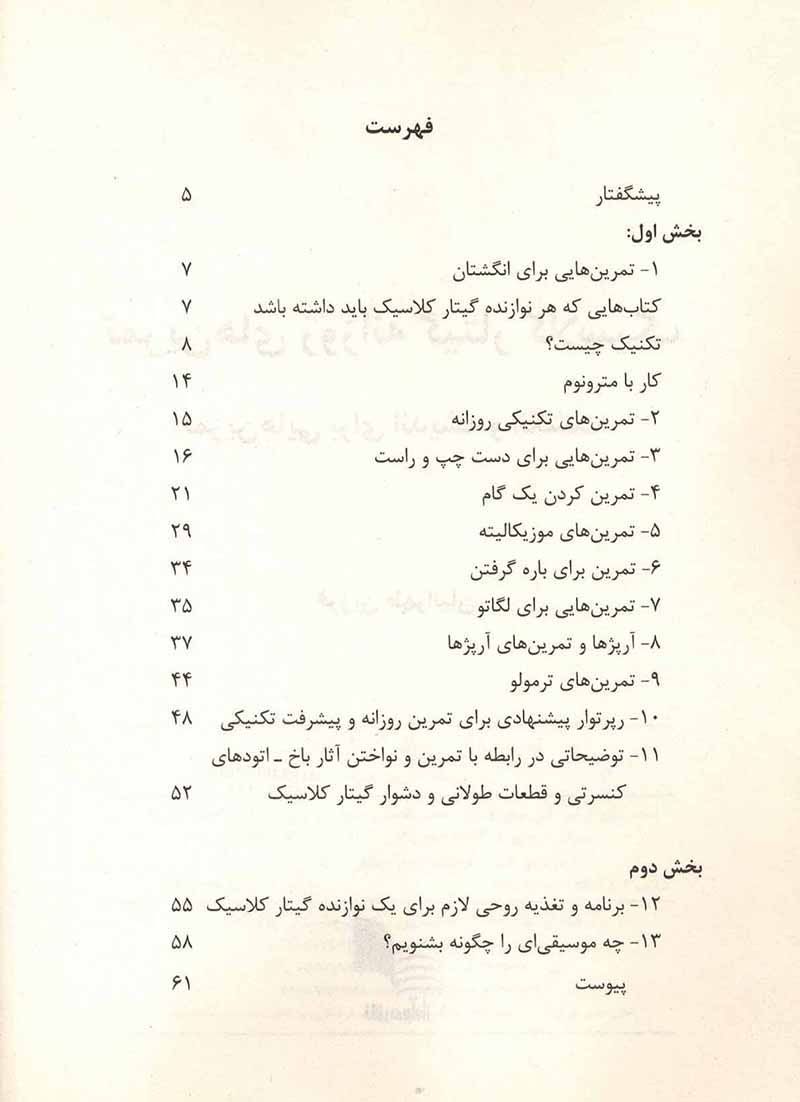 در این کتاب شامل تمرین هایی برای انگشتان و تمرین هایی برای دست راست و چپ، تمرین کردن گام و... میباشد.