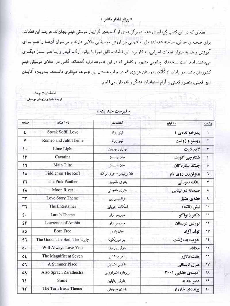 قطعاتی که در این کتاب گردآوری شده اند، برگزیده ای از گنجینه گران بار موسیقی فیلم جهان اند.هرچند این قطعات، برای صحنه ای خاص ساخته شده اند. ولی برای به تنهایی نیز ارزش موسیقیایی والایی دارند و می توان آنها را هم برای آموزش و هم به عنوان قطعات اجرایی به کار برد. این قطعات قابل اجرا با پیانو، ارگ، گیتار و یا هر ساز دیگری می باشند.