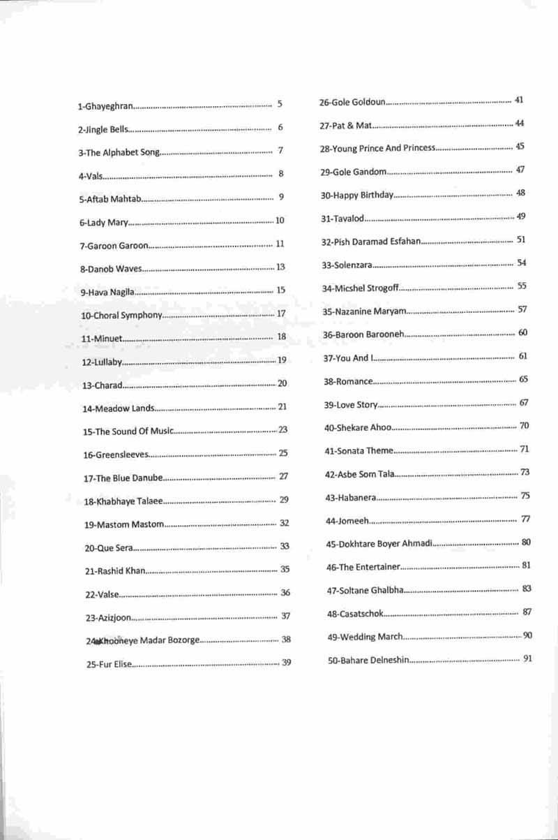 سیاه سفید کتاب اول گلچینی از قطعات ایرانی پاپ و کلاسیک برای پیانو و دیگر ساز ها.