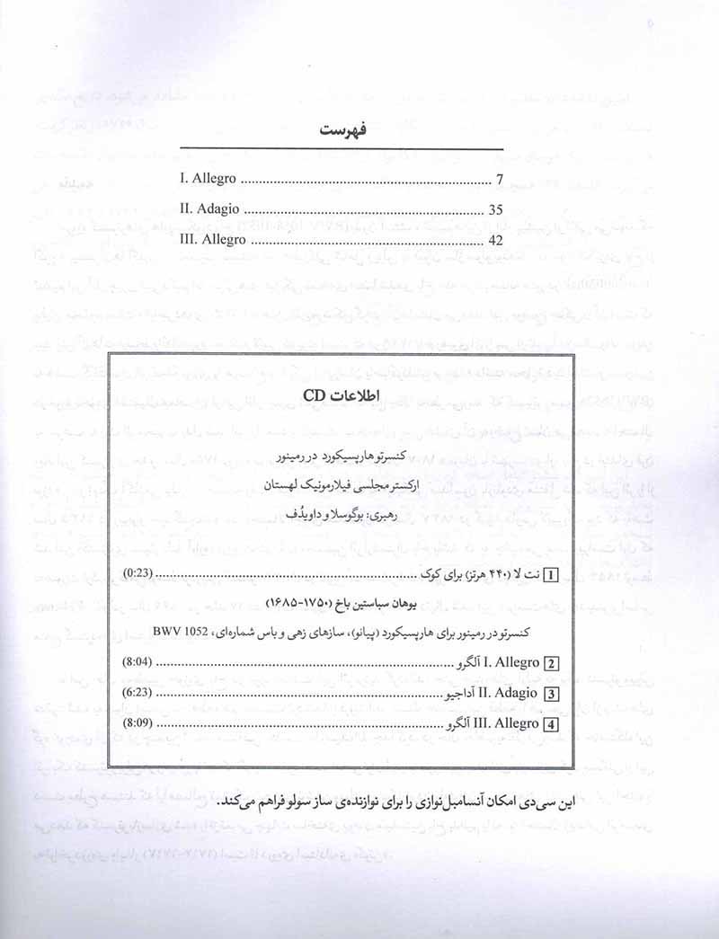 این کتاب شامل کنسرتو در ر مینور برای هارپسیکورد (پیانو) و سازهای زهی ، تنظیم برای دو پیانو می باشد