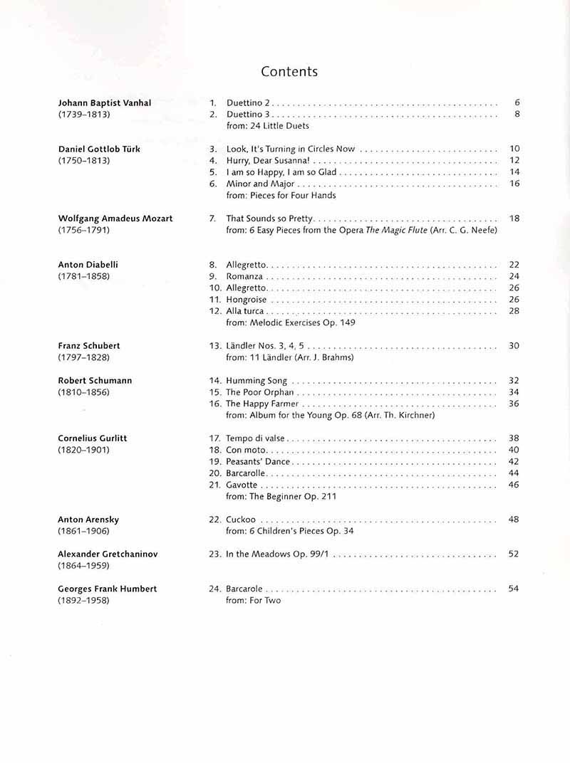 نشستن در کنار یکدیگر پشت شستیهای پیانو برای اجرای قطعات دوئت (دو نفره) یک ماجراجویی پرطرفدار است. از میان ترکیبهای دونفرة مشهوری که از اجرای قطعات دوئت لذت میبردهاند میتوان به «ولفگانگ آمادئوس موتزارت» و خواهرش «نانرل» اشاره کرد که در کودکی تورهای کنسرت دونفره برگزار میکردند؛ «فلیکس مندلسون» موسیقیهایی برای اجرای خود و خواهرش نوشته است؛ «یوهان برامس» نیز قطعاتی را روی پیانو در کنار «کلارا شومان» اجرا کرده است. این کتاب به ترتیب زمانی، شامل قطعات اصلی پیانویی آسان است که برخی از آنها توسط آهنگسازانی مشهور به شکل دوئت تنظیمشدهاند («موتزارت» با همراهی «گوتلوب نیف» ، معلم «بتهوون»، «شومان» به همراهی «تئودور کیرشنر» که خود آهنگسازی موفق بود و همچنین «شوبرت» در کنار «یوهان برامس»).