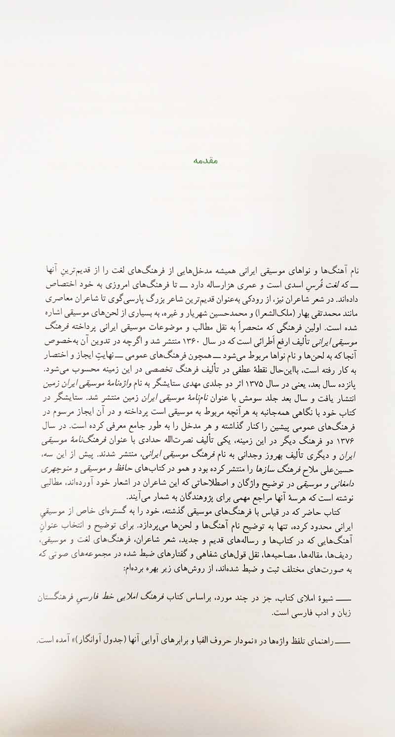 هدف اصلی این فرهنگ، صرف نظر از جمع آوری و شرح و توضیح نام آهنگ های قدیم و جدید، بازیابی اختلاف ها در نام و مطالب گوشه های موسیقی و معرفی درست ترین روایت ها بر اساس مقایسه ردیف های موجود بوده است. این کتاب از این منظر به خصوص علاوه بر کاربرد عمومی اش، می تواند دستیار نوازندگانی باشد که در حال نواختن گوشه های ردیف اند. به همین منظور، تا حد امکان و ضرورت ، با توجه به به ظرفیتهای چنین فرهنگی، توضیح و تفسیر فنی گوشه های موسیقی هم در دستور کار بوده است. به طور کلی در اینجا، به خصوص در مدخل هایی که مربوط به موسیقی امروز هستند، "تفسیر و تحلیل" با " تعریف و تدوین" آمیخته و همراه شده است.