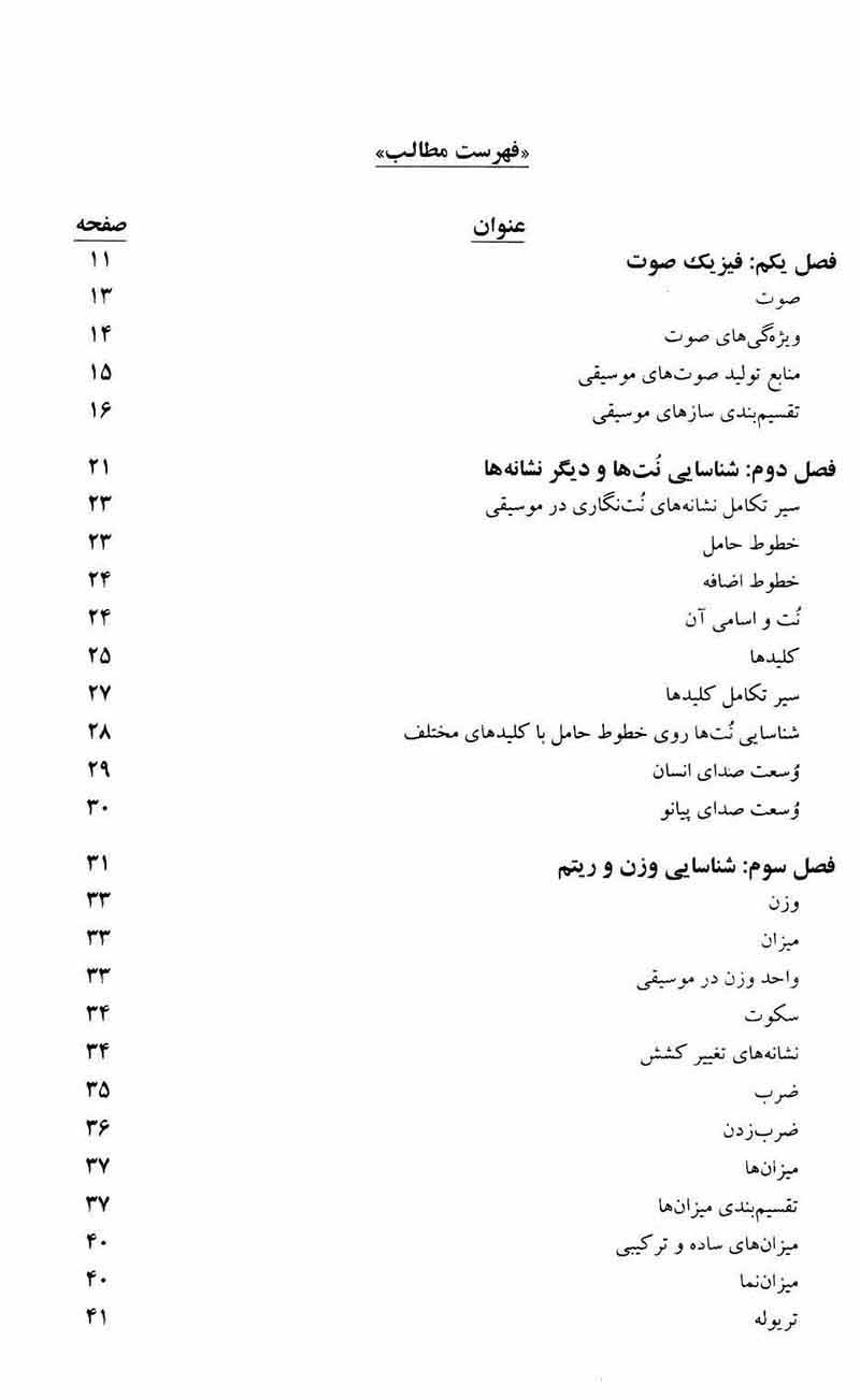 این کتاب شامل 8 فصل است که اهم مطالب تئوری موسیقی، در آن گنجانده شده است. از ویژگی های مهم این کتاب، گنجاندن مطالب سودمندی از تئوری است که بعضا در غالب کتاب های رایج، کم تر به چشم می خورند. همین موضوع به غنای بیشتر این کتاب افزوده است. مطالعه این کتاب را به تمام استادان، مربیان و هنرجویان، توصیه می نماییم.