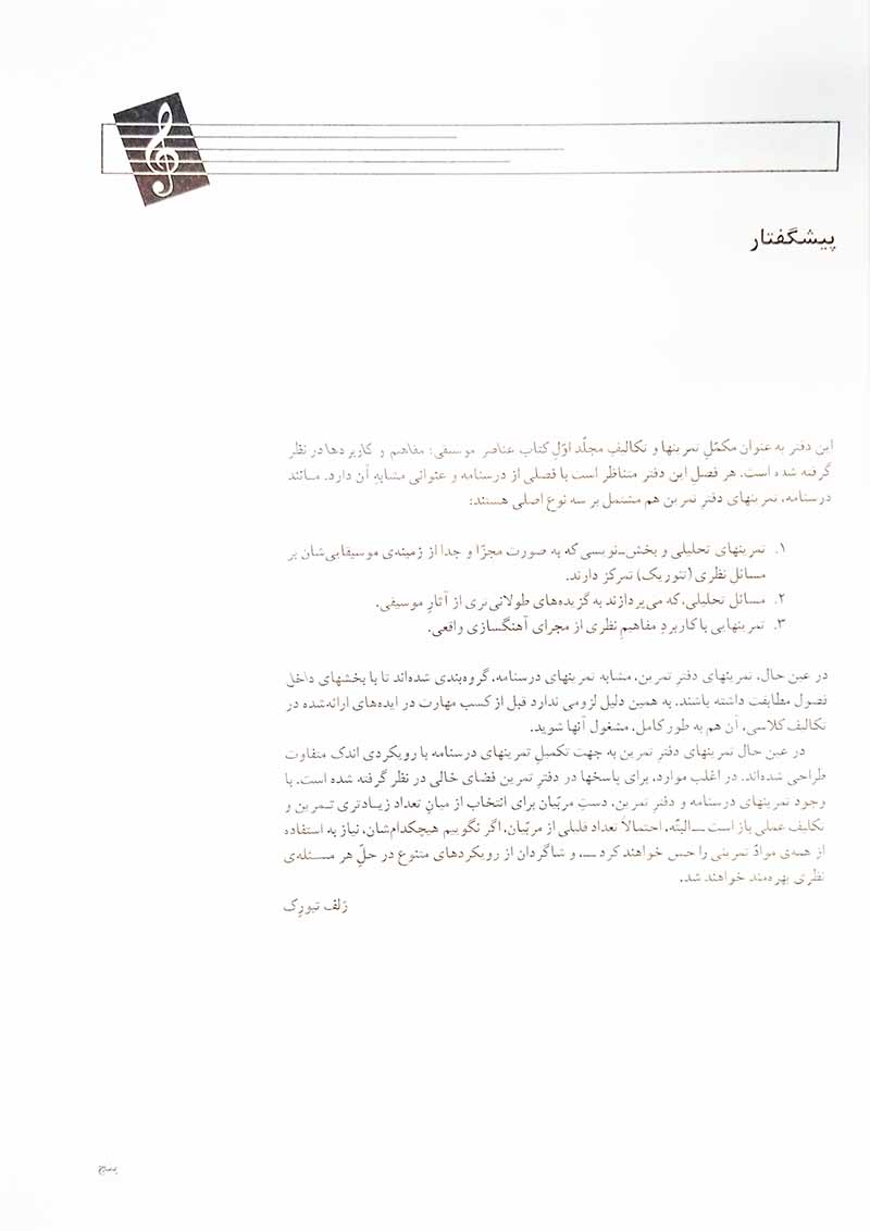 این کتاب به عنوان مکمل تمرینها وتکالیف مجلد اول کتاب عناصر موسیقی