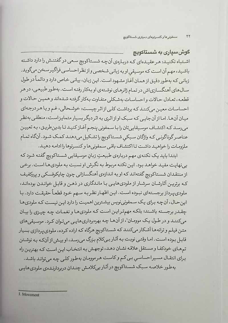 کتاب حاضر سفری موسیقایی به تمامی سمفونیها و کنسرتوهای دمیتری شستاکویچ است. این سفر، سفری شنیداری خواهد بود؛ تجربهای ویژه که میتواند شناخت و آگاهی مخاطبِ موسیقی شستاکویچ را بهمراتب فزونی بخشد. از خصوصیات بارز این کتاب باید گفت که علاوه بر اینکه متن به توصیف و بررسی کامل آثار پرداخته است، طراحی و چیدمان توضیحات بهنحوی است که کاملاً با نسخهی شنیداری هر اثر مطابقت دارد. ضمناً برای هر سمفونی و کنسرتو یک نسخهی شنیداری انتخاب شده است که ثانیهها و دقایق قابل تفسیر متن متناسب با نسخهی شنیداری مشخص شده است. همچنین نمونههای متعددی از پارتیتور هر اثر (بیش از هزارودویست نمونه) به جهت مطالعه و درک مطالب انتخاب و نتنگاری شده است که این موضوع میتواند در کنار تحلیل شنیداری، به درک بهتر متن و شناخت هرچه عمیقتر از آثار بینجامد. البته به همراه کتاب، فایل فشردهای شامل پارتیتورها و اجرای صوتی تمامی سمفونیها و کنسرتوها هم برای علاقهمندان در نظر گرفته شده است.