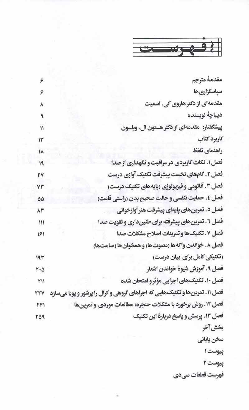 کتاب حاضر دومین ترجمه ای است که به هنرجویان ارجمند صدا و آواز تقدیم می شود.به دلیل پژوهش های دقیق و چند جانبه مؤلف نکته سنج آن، مطالب و تمرین های ارائه شئه کتاب برای تمامی اهالی صدا و خوانندگی و همچنین بیان بازیگران از مبتدی تا حرفه ای ، همچنان معتبر و کارآمد است.
